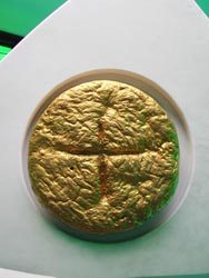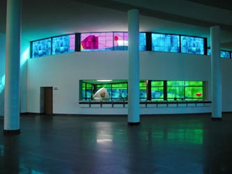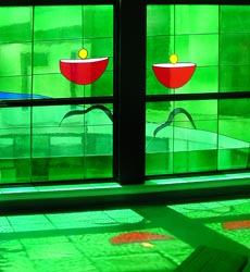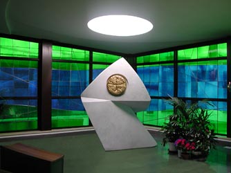 Dopo aver ammirato la vasta estensione vestita di luce dell�aula ecclesiale entriamo in un ambiente pi� intimo: la cappella del Santissimo, un luogo di raccoglimento interiore che ci avvince subito per la sua atmosfera di pace e di profonda serenit�. Qui le vetrate creano sfumature di un verde riposante, un clima mistico per la preghiera e l�adorazione. Cuore e centro della cappella � il tabernacolo in bianco statuario di Carrara: la porticina dorata raffigura un grande pane, proprio come quello che si cuoceva in campagna, con la semplice croce incisa dalle massaie per farlo ben lievitare. Ora quella croce � l�, proprio alla portata dei fedeli che non hanno ostacoli nell�avvicinarsi ad essa e spesso ne seguono con la mano il tracciato prima di lasciare la cappella. Le panche di pietra, larghe e solide, accolgono con naturalezza i fedeli e li mettono a proprio agio nell�abbandonarsi ai loro pensieri, alle preghiere e all�adorazione. L�incessante frequenza delle persone, gli atteggiamenti di profondo raccoglimento e di fiducioso dialogo dimostrano quanto sia apprezzato e goduto questo luogo in cui l�arte di P. Costantino ha trovato una delle sue espressioni pi� felici.