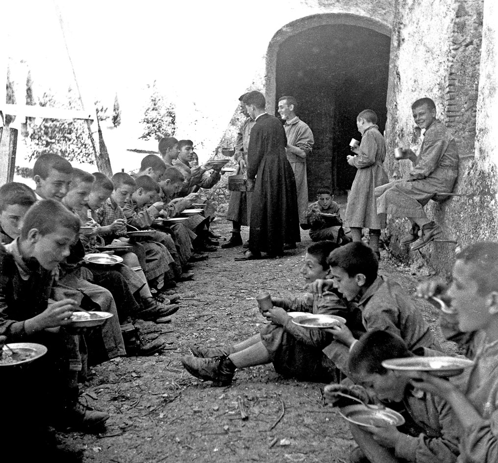 come una sorprendente fioritura, la rinascita del Santuario. Don Terenzi ne fu rettore e quindi parroco ininterrottamente dal 1931 al 1974, anno della sua morte. Quando Don Terenzi, neppure trentenne, per la prima volta arrivò a Castel di Leva, il Santuario era ridotto ad una decadenza estrema e vergognosa. La sua attività era limitata a soli due mesi l’anno, in pratica dal giorno di Pentecoste fino a luglio. Per il resto del tempo i locali del Santuario non raramente finivano per diventare anche stalle, rifugio di animali domestici e deposito di fieno. Ad un cronista del 1930 apparirà come «un villaggio abbandonato dopo un saccheggio». Luride capanne di legno, banchi d’osteria, cumuli di rifiuti, su per l’androne, presso la chiesa, fino sotto l’altare della Madonna. Al Santuario mancava anche l’acqua potabile e i venditori ambulanti a caro prezzo la vendevano – incerta di sapore e di provenienza – ai pellegrini. Ma i disegni della Provvidenza si realizzano malgrado, anzi, in un certo senso, proprio «attraverso» la povertà, i limiti e le debolezze degli uomini. È accaduto così anche per il Divino Amore. Il 22 giugno del 1930 i ladri «visitarono» il Santuario, spogliando la Madonna dei monili preziosi donati in ringraziamento dai fedeli. Proprio quel furto, sebbene rimasto impunito, ebbe però il merito di risvegliare l’attenzione per l’antico Santuario da troppo tempo lasciato in stato di abbandono. Appena informato del furto, il Cardinale Vicario inviò al Divino Amore un suo visitatore apostolico, Monsignor Migliorelli, il quale portò con sé un giovane sacerdote romano, Don Umberto Terenzi, viceparroco di Sant’Eusebio a piazza Vittorio. In seguito alla relazione di Monsignor Migliorelli si decise che un sacerdote dimorasse stabilmente al Divino Amore con il titolo di rettore. La scelta cadde proprio su Don Terenzi, il quale, inizialmente, accolse l’invito con una certa titubanza. Non se la sentiva proprio, il giovane sacerdote, di stare solo laggiù in quella che era una vera e propria topaia, circondato da venditori di paccottiglie ed esposto alle sortite di ladri e malintenzionati. «Era il luogo dei briganti – ricorderà Don Umberto molti anni dopo. – Sì, c’era la Madonna, faceva miracoli, ma la gente che stava intorno!?... Dio solo lo sa». A dare una mano a Don Terenzi furono due avvenimenti. Un miracolo, attribuito proprio all’intercessione della Madonna del Divino Amore, con il quale ebbe salva la vita in un incidente stradale. E l’incontro, del tutto casuale, con un suo amico sacerdote in fama di santità, Don Luigi Orione. Quel Don Orione, grande apostolo della carità e fondatore del Piccolo Cottolengo, che nel 1980 Giovanni Paolo II ha solennemente elevato agli onori degli altari dichiarandolo beato e nel 2004 santo.