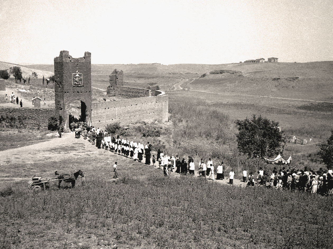 Fin dal 1081 (quando per la prima volta se ne trova menzione in una bolla di Gregorio VII) quella terra era appartenuta all’Abbazia di San Paolo. Più in là nel tempo la proprietà passò alla chiesa di Santa Sabina e, quindi, nel 1295, alla famiglia dei Savelli. Il castello fu costruito proprio in quegli anni. Successivamente, probabilmente per mano di un autore della scuola romana di Pietro Cavallini, fu eseguito il dipinto della Madonna, che in attesa di compiere il primo miracolo – come sottolineano i versi di un poeta dialettale – «stette lì, sola soletta, pe’ tre secoli bòni, allo scoperto». In quell’epoca, infatti, un po’ tutta la campagna romana, ma in particolare quel tratto, era arida e abbandonata. Solo d’inverno vi si spingeva qualche pastore per far pascolare il gregge di pecore. In tanta desolazione, l’unico segno di vita e di conforto era appunto il dipinto della Madonna, ai piedi della quale la sera i pastori si riunivano per recitare il rosario. Nel 1740, in un pomeriggio di primavera, accadde il miracolo. E l’immagine della Madonna dipinta su quella torre diroccata divenne presto la meta di pellegrini, «sempre più devoti e numerosi, che ricevevano numerose grazie». Una casa per la Madonna