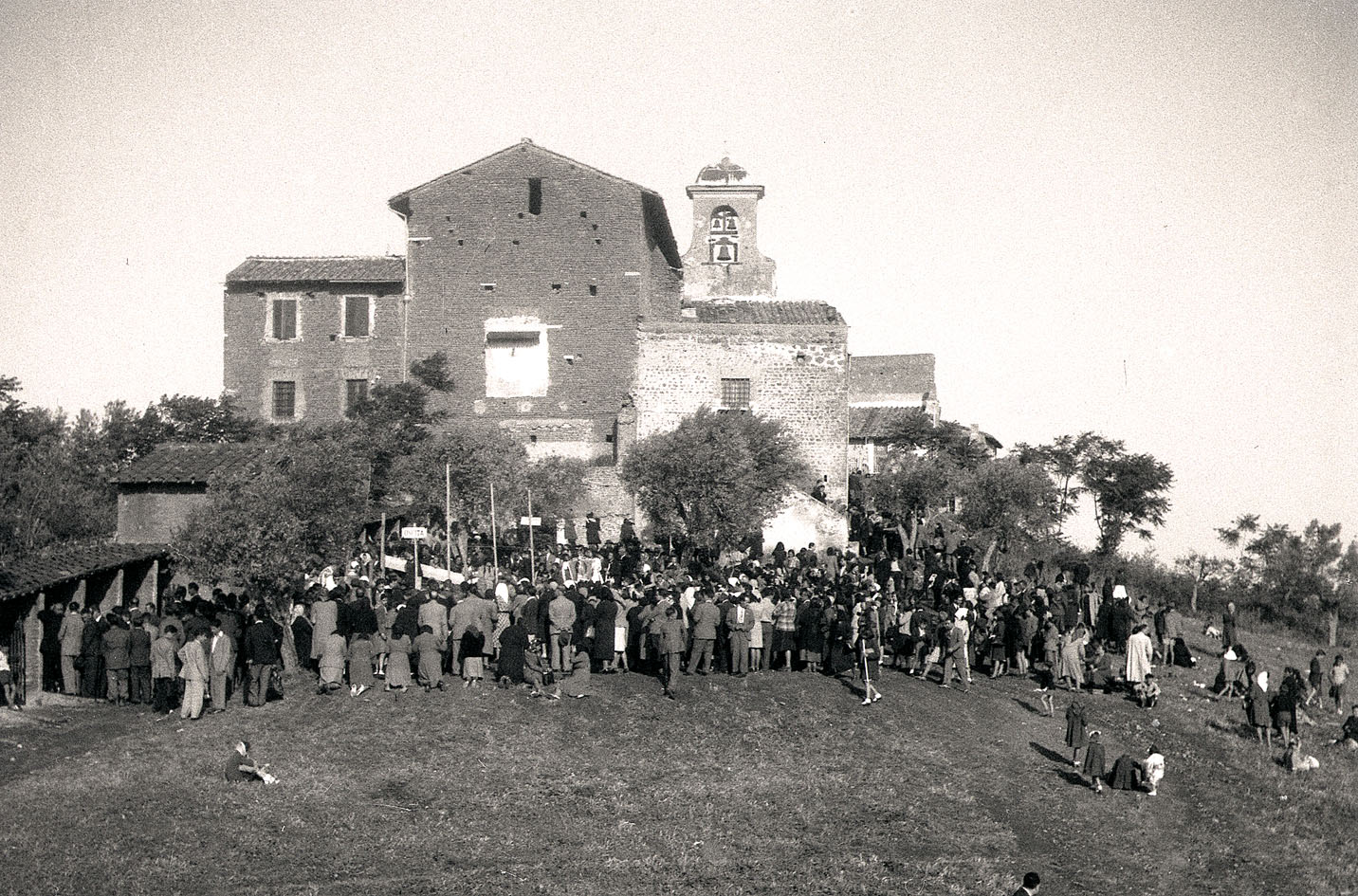 Da sempre quello che accorre al Divino Amore è infatti il popolo festante e «caciarone» delle processioni, dei colori sgargianti delle feste paesane, dei sapori forti delle scampagnate «fuori porta». Con facilità, è vero, mescola sacro e profano, presta poca attenzione ai progetti e ai programmi pastorali della Chiesa locale, ma è anche il popolo che, anche oggi in un contesto di profonda secolarizzazione, si segna con la croce davanti all’immagine della Madonna, ascolta con composta serietà, quasi con venerazione, le parole del prete dall’altare, frequenta i sacramenti, obbedisce ai comandamenti, riconosce la Chiesa come sua Madre. Come tutti, questo popolo, potrà tradire, allontanarsi, ma sempre, come il Figliol Prodigo, per infine ritornare, accendere una candela, battersi il petto e recitare un’Ave Maria. È un popolo che sta ai dati essenziali del catechismo, e che è istintivamente allergico ad ogni supplemento intellettualistico della fede. «Il popolo non sa – affermava ancora don Giuseppe De Luca – ma questo non vuol dire che il popolo sia fuori della vita cristiana. La vita cristiana non è cultura, nemmeno è cultura cattolica. La vita cristiana essenzialmente è conoscere Dio e amarlo. Chi sappia tutto questo, anche se non lo sa altrimenti che adempiendolo, sa tutto». Una vecchia torre abbandonata Perché un Santuario in località Castel di Leva, in un posto così fuori mano, lontano dal centro abitato, là tra la via Ardeatina e la via Appia Antica? Pur essendo così congeniale alla propria spiritualità, gli stessi romani poco sanno dell’origine del Santuario e della devozione cui l’edificio è votato. La storia del Santuario è davvero inconsueta. Non è legata ad una apparizione della Madonna, ma ad una antica immagine della Vergine in trono con in braccio Gesù Bambino, sovrastati entrambi dalla colomba simbolo dello Spirito Santo (di qui il titolo di Madonna del Divino Amore). Il dipinto era posto su una delle torri di cinta di un antico castello, il castello dei Leoni (da cui la degenerazione in Castel di Leva), che nel 1740, anno del primo miracolo, appariva già diroccato, forse distrutto da un terremoto.