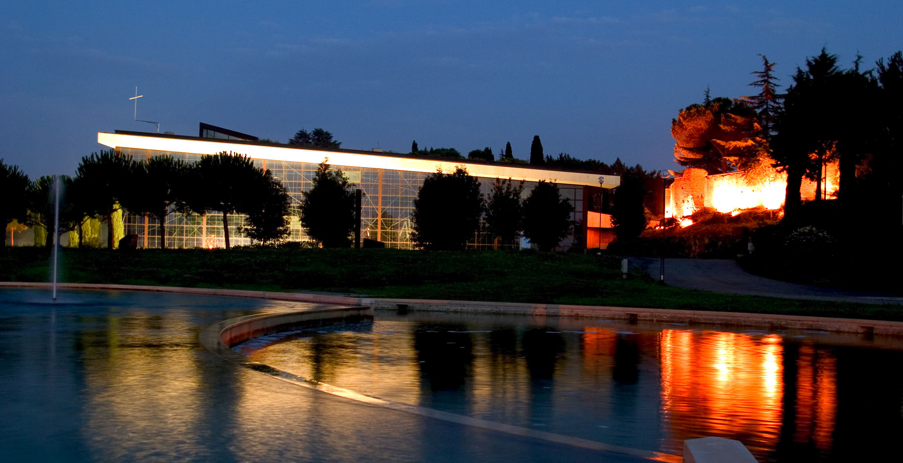 Ora che il Santuario è realizzato, a rileggere queste parole ci si accorge quanto fosse precisa e felice l’idea ispiratrice del progetto e come il nuovo tempio la rispecchi fedelmente. Dopo circa dieci anni di intenso e appassionato lavoro l’opera era compiuta e si giunse finalmente alla solenne cerimonia del 4 luglio 1999. Giovanni Paolo II consacrò il nuovo Santuario circondato da tutti i Vescovi del Lazio e da una imponente partecipazione di fedeli. Da quel giorno radioso, al Divino Amore è sempre costante l’affluenza dei pellegrini e la chiesa accoglie a volte anche di notte le loro preghiere e i loro voti. |