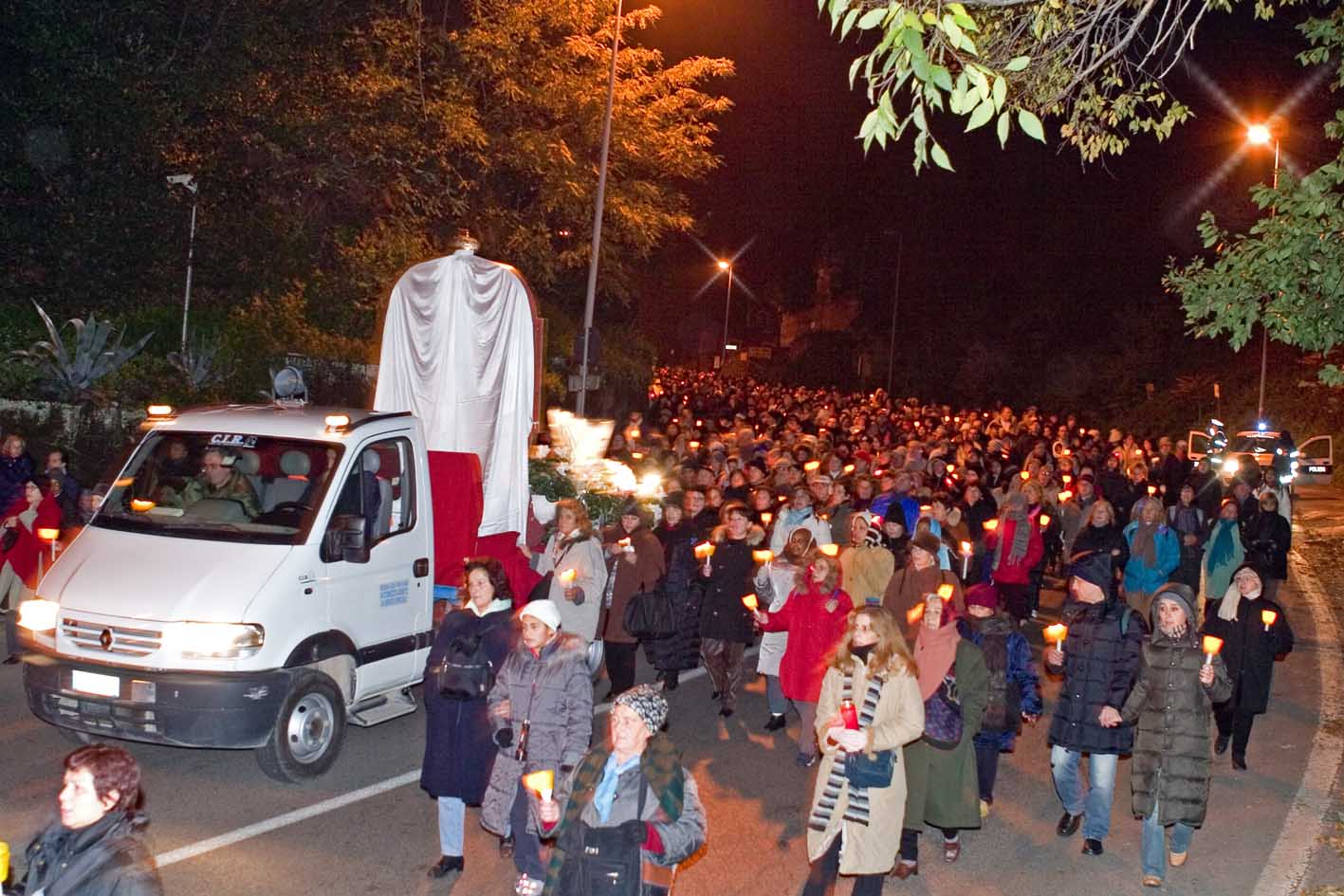 IL PELLEGRINAGGIO Nella notte in cammino con Maria «Ma voi non sentite che cosa cantano e a chi?»: perfino ad un noto anticlericale come Giosuè Carducci, il poeta autore dell’inno A Satana, è capitato di commuoversi al passaggio dei pellegrini del Divino Amore. Era una calda sera di primavera di oltre 100 anni fa e l’anziano uomo di lettere, intento a prendere un po’ d’aria sul balcone dell’abitazione in cui era ospite, fu visto lacrimare. Nessuno dei presenti, inizialmente, capiva il perché. Forse pensava a qualcuno lontano, ricordava qualcosa di perduto, fantasticava di un sogno. Gli domandarono cosa avesse. Ed egli indicando sotto: «Ma non li sentite?». Passavano per la strada i pellegrini diretti al Santuario di Castel di Leva, i quali cantavano come si canta solo in campagna, con i versi fortemente scanditi, distanziati dalla sillaba finale su cui la voce giunge pienissima per poi lentamente smorzarsi. Quel canto di lode a Maria sovrastava il rumore e il vocio della strada e ridestava anche nel cuore indurito di un vecchio «mangiapreti» la nostalgia di una umanità più lieta. L’avere ascoltato quei canti, l’essersi imbattuto, anche se solo osservandola da lontano, in quella porzione di popolo di Dio pellegrinante, aveva potentemente diradato la nebbia del suo animo. Per un attimo, forse solo per un attimo, aveva avuto la nitida percezione di una realtà che sorprendentemente rispondeva alle attese inappagate del proprio cuore. È questa la forza del pellegrinaggio: l’essere il paradigma della vita cristiana. L’essere cioè l’immagine di una umanità nuova che è cosciente del proprio destino, che sa che la propria vita non sfocia in un nulla indefinito. Una umanità che sa che il camminare – così come il vivere quotidiano, il sudare, il lavorare, l’amare, il lottare, il morire – ha un significato, ha una meta. Una umanità, infine, che sa che questa meta si è fatta incontro, si è resa compagnia stabile, ha preso dimora sulla terra incarnandosi nel seno della Vergine Maria ed è presente ogni giorno nella vita della Chiesa. Una umanità così potrà anche soffrire, potrà essere ridotta agli stenti, ma, poiché vive della grazia di Dio, sarà sempre lieta. Per questo canta, per questo anche solo la sua vista commuove. «Non c’è da meravigliarsi – scriveva negli anni trenta Don Umberto Terenzi – se nonostante le profanazioni e l’abbandono materiale del sacro colle, le folle dei pellegrini avevano seguito ad affluire costantemente al Santuario nei mesi tradizionali di maggio e giugno, perché la devozione al Divino Amore era stata sempre grande». Sin dal 1740, anno del primo miracolo, i romani più devoti percorrono a piedi i quattordici chilometri che separano la città da quell’immagine miracolosa. L’appuntamento, ogni sabato sera dalla Pasqua sino alla fine di ottobre, è da decenni nello spiazzo antistante l’edificio che ospita la Fao, nei pressi delle Terme di Caracalla. Ancora oggi, dopo la mezzanotte, è facile incontrare la lunga fila di pellegrini con le torce accese che si incamminano verso Porta San Sebastiano lungo la via Appia Antica. Alternando il canto alla preghiera, alle litanie, alla recita del rosario, il corteo dei fedeli sfila dinnanzi alla chiesetta del «Quo vadis», alle catacombe, al mausoleo delle Fosse Ardeatine, in un suggestivo itinerario di fede e di memoria che si conclude, quando è ormai l’alba, al Santuario di Castel di Leva. La via Appia