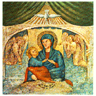 imagen da Virgem representada no trono ao colo o Menino Jesus, e com a pomba que descende sobre ela